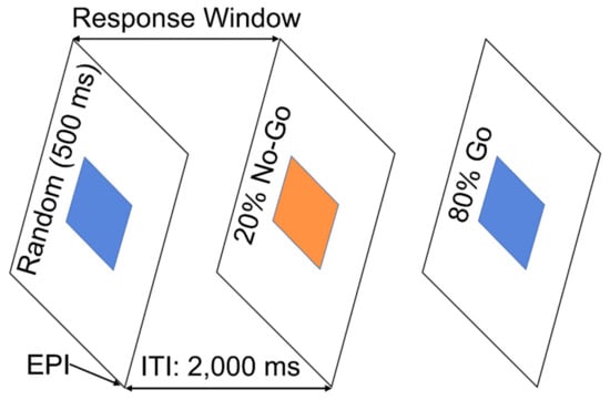 In this task, 200 visual stimuli, either a blue or an orange square, were presented to the participants for a duration of 500 ms at regular 2000 ms intervals. Participants were asked to press a button as quickly as possible with their right index finger if they saw a blue square (a Go trial) and refrain from pressing the button if they saw an orange square (a NoGo trial). Both speed and accuracy of performance were emphasized. There were 160 (80%) Go trials and 40 (20%) NoGo trials in the task. The beginning of each trial was synchronized to the beginning of an Echo Planer imaging (EPI) volume acquisition by a trigger pulse sent from the MRI scanner to the stimulus presentation software. The 200 Go and NoGo trials were randomly interspersed without any constraints over the course of the 200 EPI acquisitions (400 s). The response/refrain window was 2000 ms, during which the Reaction time (RT) to the successful Go trials was recorded, whereas responses to NoGo trials in this time window were identified and recoded as errors. Performance accuracy measures were derived by calculating the average number of correct responses for Go and NoGo trials separately. Please see the illustration below in Figure 1.