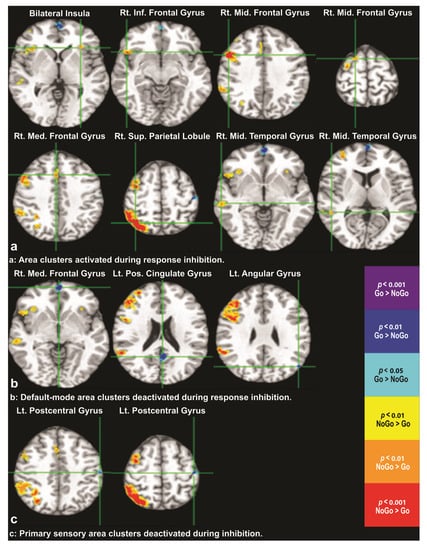 In the context of these hypotheses of inhibitory functions and their brain substrates, the NoGo activation findings across groups in the present study tend to conform more to the common network mechanism model proposed by Hampshire and colleagues. While findings of predominantly right frontal brain area activation (first 5 images in Figure 2a) suggest the importance of right prefrontal cortical regions in response inhibition circuitry, as proposed in the “right frontal” hypothesis [,,], findings of right fronto-parieto-temporal and ventral attentional network activation (Figure 2a; positive activation direction in Table 2) support the common network mechanisms hypothesis [,,,]. In addition, we found deactivation in different brain areas during successful response inhibition which, based on their anatomical locations, have been identified as part of the default-mode network (Figure 2b) and motor response regions, which may be related to withholding from the button press response (Figure 2c). Furthermore, deactivation of these regions in the respective functional circuits may serve as validation for the activation network during successful response inhibition (Figure 2a).