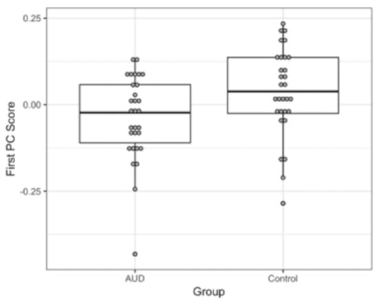 Boxplots of the 1st principal component scores in the AUD and control groups. The scores were significantly different (p < 0.02) between groups, as determined by a nonparametric Mann–Whitney U test.