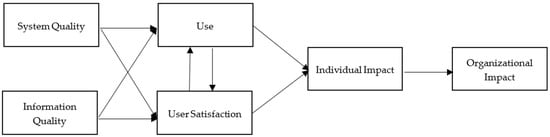 In the literature, many frameworks have been proposed to assess the success of information systems. One of the most validated measures is the Information Systems Success Model (IS Success Model) developed by DeLone and McLean [5,6]. Based upon the communication research and management information research (MIS), they proposed an interrelated link between use/user satisfaction and organizational impact mediated by individual impact. Both use and user satisfaction are shaped by system quality and information quality in the 1992 model they developed. In 2003, DeLone and McLean proposed an updated model. Service quality was included as one of the variables in terms of user satisfaction and use/intention to use. Intention to use was added as an alternative variable because “simply saying that more use will yield more benefits, without considering the nature of this use, is clearly insufficient.” [6] (p. 16). DeLone and McLean grouped two variables (i.e., individual impact and organizational impact) into one (i.e., net benefits) in order to be more inclusive in the future application of the IS Success Model. In this study, the framework of the IS Success Model is used in order to test the proposed hypotheses which guide this investigation.