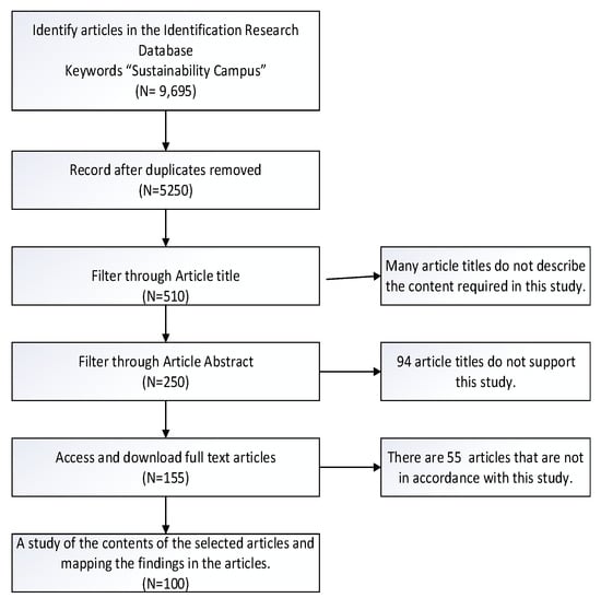 The number of articles used as the basis for a systematic review is 100 article titles. This number was filtered from the portal database with the keyword “sustainable campus” title, which found 9695 titles. The number of titles was obtained from Portal: EBSCOhost Research Databases; tracked using Keywords: Sustainable campus; in Source Types: Academic Journals; Data base: Academic Search Complete; Journal category: peer reviewed; and published in the range of 2011 to 2021.