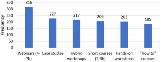 Most respondents would rather take part in 4 to 7 h-long webinars (23%), but there is a close preference for the other types of events (Figure 2). A close second would be case studies and hybrid workshops where people would view online but watch how it is performed. These results are again in contradiction to the ones of [12], who questioned medical students, and their result was in favor of physical classes (67%). The results of [13] are also contrary to ours because in their case 73.8% of the students preferred offline classes. In our case, the respondents are in favor of webinars and case studies which are online and not hands-on, which would be physical.