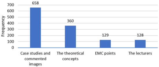 The main reasons (52%) for taking part in such an event were the case studies that were presented and the commented images (Figure 3). The second most important aspect was the theoretical concepts (28%), while the collection of EMC points and the lecturers were not considered as important by most. The efficiency of these development programs (as seen from Figure 2 but also Table 2) are again in contradiction with the results of [14], who focused on residents and their opinion on online classes. In their studies, 88% of the respondents considered that online courses are not sufficient for their professional training. Again, we are considering here the fact that these differences are coming from students (even if they are in their last years) because a study by [15] also shows similar results to ours. In this study on healthcare professionals, half of the respondents were extremely satisfied with the online courses.
