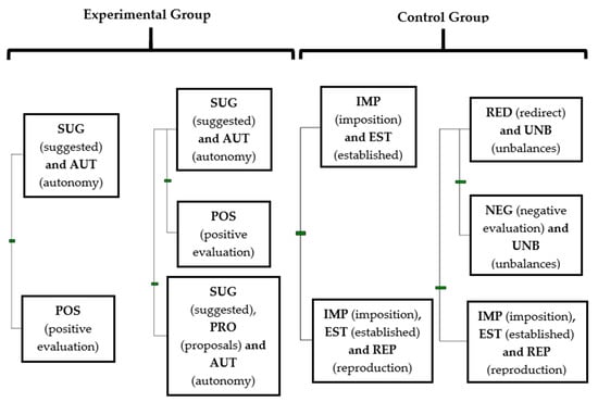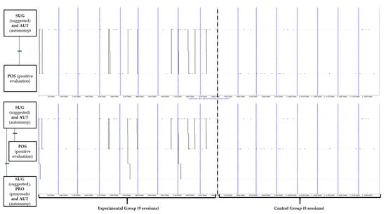 - The EG teacher suggested (SUG) the intervention of the students, giving them autonomy (AUT) and also giving them a positive evaluation (POS). The teacher’s combination of positive evaluations (POS) and suggestions (SUG) led to the autonomous response (AUT) of the students. The teacher’s proposal of new opportunities for success (PRO) also allowed for attention and effectiveness in achieving the session’s objectives.