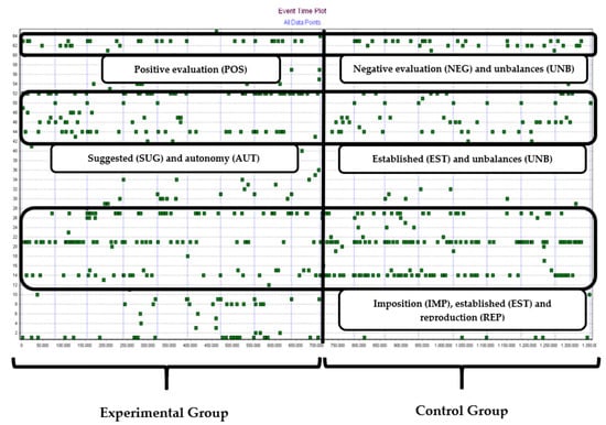 Figure 2 shows the Event Time Plot of all the events registered throughout the intervention. The x axis is the temporal line of frames separated by periods of 5 min (almost 8.000 video frames). The y axis refers to the codes of behaviours observed (e.g., number 41 concerns SUG and AUT (suggested and autonomy)). The solid vertical blue lines separate the sessions and the vertical solid line in the centre separates EG and CG. We highlighted rectangles to emphasise the codes of behaviours that appear, whether it be more density or a lack of density, in order to offer a more detailed analysis of the performance of the two teachers.