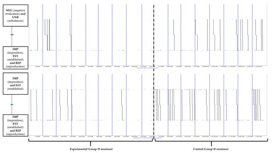 The representation of all sessions is shown and in the middle area of Figure 2, a higher concentration of behaviours of the EG teacher conformed by suggestion (SUG) and autonomy (AUT) of the student can be seen that were more numerous than those of the CG teacher on the right side. In line with this, we can verify the accumulation of behaviours in all sessions of the CG teacher, represented on the right side and in the lower area, of imposing instructions (IMP) and establishing organisation (EST) in the activities that generated reproductive responses (REP) from the students. In the upper area, the positive assessment (POS) of the EG teacher and the negative evaluation (NEG) of the CG teacher and the maladjusted behaviours (DES) of the students in this group are represented.