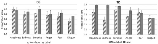 The post hoc analyses of the second-order Group × Label × Emotion interaction revealed no intergroup differences, but there was a significant effect of label in the non-emotional (+3.11) and emotional (+3.04) conditions for the TD group (p < 0.001). For the DS group, the effect of label was not significant in the non-emotional condition (+0.82, p = 0.592) but was significant for the emotional condition (+1.57, p = 0.018). In both groups, emotion recognition was better with a label than without one.