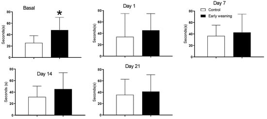 There were no differences in time spent in all four arms between the control and early-weaned group. However, an analysis of the time spent in the maze’s central platform showed that weaned animals spent more time there in the day of basal analyses, before they were exposed to alimentary stress. (Control: 25.5 ± 12.7 vs. Weaned: 47.9 ± 22.4; p < 0.05) (Figure 2).