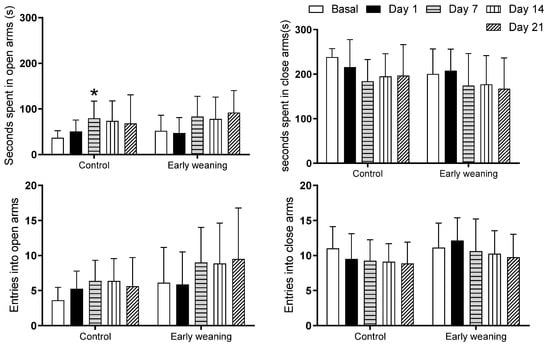 An analysis comparing different days showed that the control group spent more time in the open arms on the 7th day than compared to the basal analysis (Basal: 36.5 ± 15.5 vs. Day 7: 79.2 ± 38.0; p < 0.05) (Figure 3 top). There were no differences in the number of entries into each of the four arms between the control group and the weaned group (Figure 3 bottom).