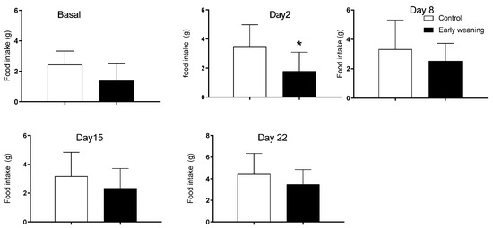 Effect of Early Weaning associated with chronic stress on chocolate cookie (Bauducco) intake. Data were obtained from animals during their 166–168 days of age (basal analysis) and on days 2 (169–171 days of age), 8 (175–177 days of age), 15 (182–184 days of age), and 22 (188–190 days of age) of alimentary stress. t-test n = 8. Data expressed as mean ± SD. * p < 0.05 vs. controls.
