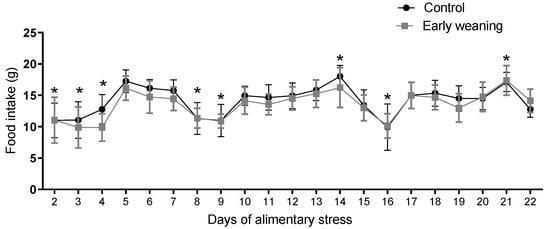 Effect of Early Weaning associated with chronic stress over standard diet intake. Data were obtained every 24 hrs between days 2 and 22 of alimentary stress. Two-way ANOVA. Bonferroni’s post-hoc test n = 8. Data expressed as mean ± SD. * Shows the points where both groups showed statistically lower values when compared to the highest levels.