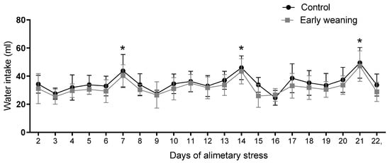 Effect of Early Weaning associated with chronic stress over water intake. Data were obtained every 24 hrs between days 2 and 7 of alimentary stress. Two-way ANOVA and Bonferroni’s post-hoc test n = 8. Data expressed as mean ± SD. * Shows the points at which both groups showed statistically higher values when compared to the lowest values, indicating peaks.