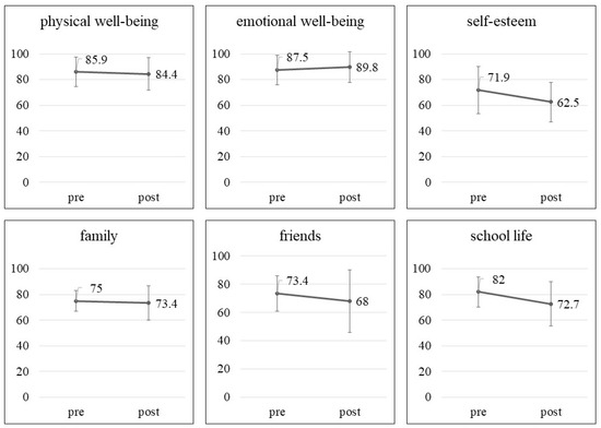The duration of gaming on weekdays was 12.5 ± 21.9 min at the pre-study timepoint and 21.3 ± 41.5 min at the post-study timepoint (p = 0.18). During the weekend, the participants played games for 88.8 ± 50.0 min at the pre-study timepoint and for 116.9 ± 108.7 min at the post-study timepoint (p = 0.47). The IGD-20 Test scores were not significantly different between the pre- (40.4 ± 7.7) and post-study (39.8 ± 12.1) timepoints (p = 0.73). Figure 2 presents the changes in the mean scores of the Kid-KINDL subscales, which were not significantly different between the pre- and post-study timepoints. In brief, there were no significant changes in the duration of gaming at home, IGD-20 scores, and Kid-KINDL subscale scores between the pre- and post-study timepoints.