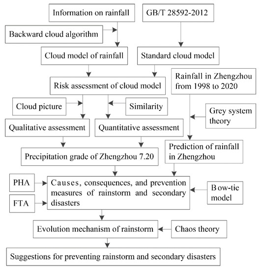 This study proposed a composite risk assessment method for rainstorms. According to the rainfall data in Zhengzhou and the national standard grade of precipitation (GB/T 28592-2012) [28], the precipitation grade of Zhengzhou on 20 July 2021 was determined using a cloud model [8,9]. To explore the predictability of extreme weather from the evaluation results of the cloud model, the GM(1,1) model [13] was adopted to predict the rainfall in Zhengzhou in July 2021, and the validity and influencing factors of the prediction results were analyzed. The PHA [17,18] was adopted to analyze the causes of rainstorms in Zhengzhou, as well as secondary disasters caused by rainstorms. For flood disasters caused by rainstorms, FTA [19,20] was used to investigate the basic reasons. For the Zhengzhou subway line-5 accident that occurred due to the flood disaster, the bow-tie model [21,22] was adopted to analyze the causes in detail. Chaos theory [26,27] was used to investigate the cross-coupling effect of human, object, environment, and management factors on rainstorms. Finally, suggestions were given to prevent rainstorms and secondary disasters.