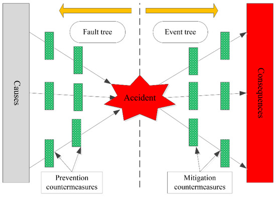 The bow-tie model consists of a fault tree on the left and an event tree on the right [21,22], as shown in Figure 2. In the bow-tie model, both the fault tree and event tree are simplified. There is no obvious logical relationship among the causes of the fault tree, and the results of the event tree also show only one state.
