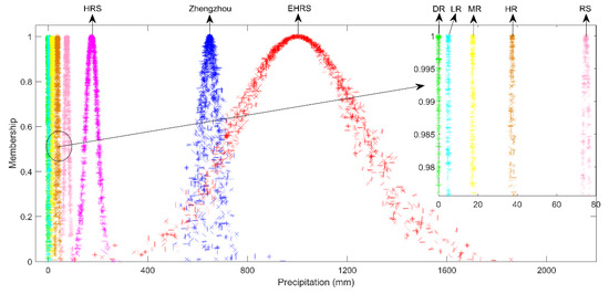 According to the CMA [1], from 6 a.m. on 20 July to 6 a.m. on 21 July 2021, the 24 h precipitation in Houzhai, Erqi District, Zhengzhou city, reached 672 mm; from 8 a.m. on 20 July to 8 a.m. on 21 July 2021, the 24 h precipitation in Zhengzhou city reached 624.1 mm. According to the backward cloud algorithm, the cloud model for the Zhengzhou rainstorm is (648.05, 30.01, 15.71).