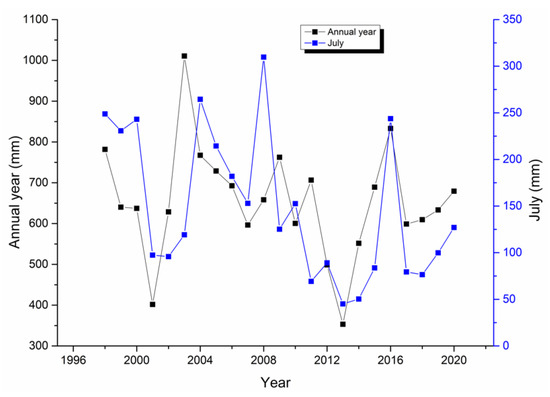 The annual and July rainfall in Zhengzhou could be obtained according to the National Bureau of Statistics [37], as shown in Figure 4.