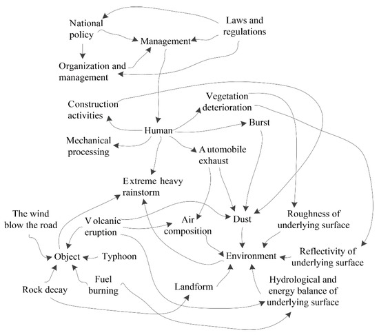 Figure 7 shows the influence of human, object, environment, and management subsystems on the evolution process of extremely heavy rainstorms. Factors located at the beginning of the arrow have an effect on the end factors. For example, once a volcano erupts, it changes the composition of the air. The management factors do not directly affect the rainstorm process. In fact, management factors indirectly affect the evolution of rainstorms mainly by restricting human behaviors and reducing damage to the environment. The dust generated by human activities and natural conditions can be used as condensation nuclei in the process of rainfall, creating favorable conditions for the formation of rainfall and increasing the possibility of precipitation. The impact of human activities on rainfall can be summarized as follows: changing the roughness and reflectivity of the underlying surface; generating dust and change the composition of the atmosphere; and generating energy and affecting airflow movement.