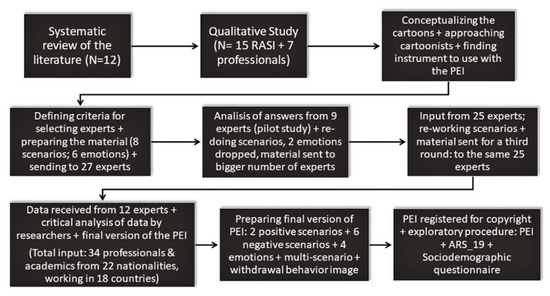 The final drawings were included in an online survey (using Google Forms) and sent to experts who provide support for RASI in several countries. The experts provided input on the eight scenarios and the six emotions. Two important criteria for selecting the experts were their amount of experience in working with RASI, and that they were from as many different countries as possible, so that the new PEI instrument would be relevant to various cultures. We conducted a pilot study to assess whether there was a need to make adjustments in the drawings or other aspects of the PEI before sending the material to a larger number of professionals and academics. The stepwise building process of the PEI is shown in Figure 1.