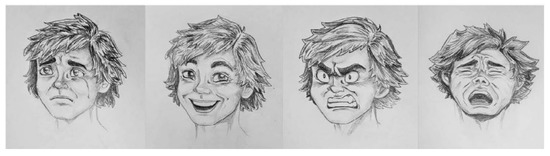 The PEI has the format of an A5 booklet; each scenario is depicted in a left page with the respective answering scale on the right-side page, so that participants see and respond to only one scenario at a time. The emotional answering scale includes drawings of four basic emotions (joy, sadness, anger, and despair), as shown in Figure 3. The emotion “joy” was included mostly in the two positive scenarios.