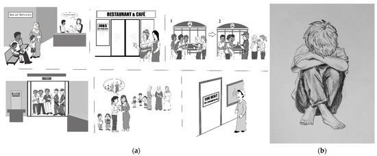 The multi-scenario (Figure 4a) consists of the six negative scenarios placed together on the left-side page of the booklet, while on the right-side page a drawing illustrating withdrawal, loneliness, sadness, and powerlessness appears. This sketch is shown in Figure 4b. The question for the multi-scenario is: As you look at the above situations (six discrimination scenarios) and remember the times this happened to you or to your friends, please say how much you feel like taking this behavior (ranging from 0—never, to 10—always). This question was motivated by two previous findings: the existence of a relationship between racial discrimination and social isolation [44], and the fact that experiencing ethnic discrimination toward oneself or toward family members or friends can have a similar impact on a person’s wellbeing [45,46].