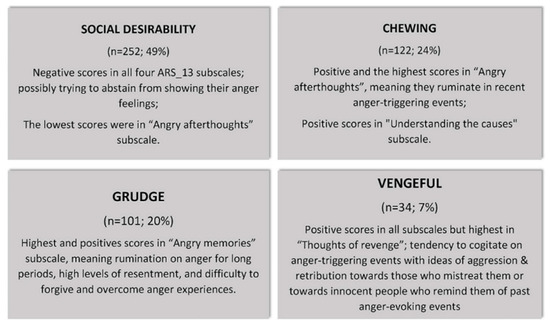 After these analyses, a K-means cluster analysis was conducted to enquire whether groups of participants could be categorized using the four factors of the ARS_13 scale. Clatworthy et al. [55] emphasized that cluster analysis offers a major contribution to various health sciences, as it helps to identify groups that may profit from specific interventions. The analysis classified the 509 participants into four categories, according to the ways they processed anger triggered by the discrimination scenarios of the PEI. The four groups were named and are explained in Figure 5. A further analysis was made to enquire whether there was a difference between sex/gender in the four clusters; however, no significant difference was found.