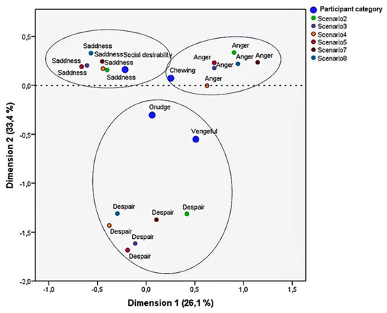 After these two analyses, a multiple correspondence analysis (MCA) was used to check the study’s third objective—to “explore whether the PEI, along with the ARS_19 can identify groups of RASI, on the bases of specific emotions triggered by discrimination scenarios”. This analysis examined whether the four categories (“social desirability”, “chewing”, “grudge”, and “vengeful”) were related to the emotions of the PEI (“sadness”, “anger”, “despair”, and “joy”) that were chosen by participants as they observed the six discrimination scenarios. It is worth highlighting that, as mentioned in Section 2.1, the emotion “joy” was included most in the two positive scenarios. The results of the MCA are presented in Figure 6.
