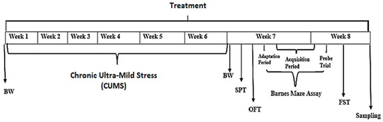The animals were housed under standard environmental conditions (24 ± 1 °C) in the Animal Transit Room at the School of Pharmaceutical Sciences, Universiti Sains, Malaysia. They were maintained on a 12-h light/dark cycle. The animals were randomly separated into six experimental groups. A chronic ultra-mild stress method was adopted to induce stress in the animals. The normal control group was without any chronic ultra- mild stress (CUMS), and the remaining groups were influenced by chronic ultra-mild stress (CUMS). Chronic ultra-mild stress remained for six weeks. Treatment remained for eight weeks means until the end of behavioral tests and sampling.