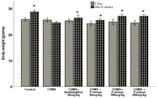 Effects of P. minus aqueous extract on body weight of CUMS induced stressed mice. * (p < 0.05), vs. zero-day of each group, (n = 14).