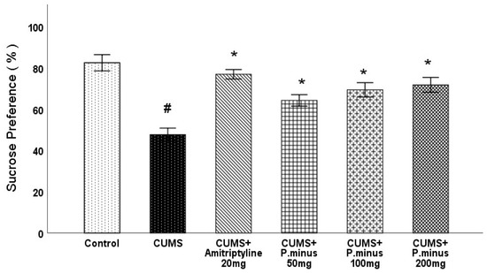 Effects of P. minus aqueous extract on sucrose preference test in CUMS induced depressive mice. # (p < 0.05), vs. Control group; * (p < 0.05), vs. CUMS group, (n = 14).
