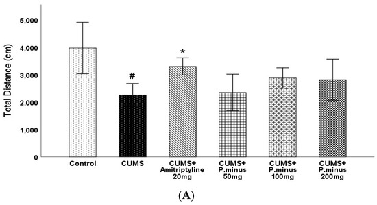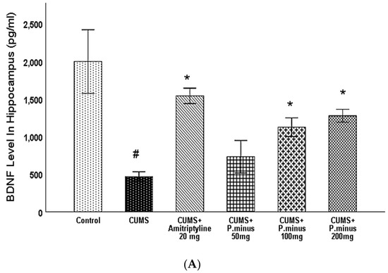 Male Balb/c mice (n = 14) were used in this study because the latest research about the cognitive effect of this extract was on male mice [20]. The study consisted of six groups. The control group was treated with simple distilled water, and the negative control was a simple CUMS group (the only stress group without treatment, though distilled water was administered); the positive control received amitriptyline at 20 mg with CUMS, and there were three treatment groups based on different doses (P. minus 50 mg,100 mg, and 200 mg with CUMS). Treatment was continued for eight weeks and chronic ultra-mild stress was applied for six weeks. The chronic ultra-mild stress protocol included some interventions like restraining stress, food, and water deprivation, wet bedding, cage tilting, tail pinching, foreign object incorporation, forced swimming, crowded housing, and continuous lighting.