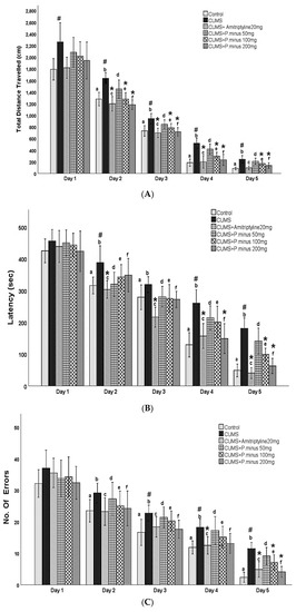 As a whole, the results of Barnes maze analysis showed that all groups learnt about the task day by day, but CUMS group and CUMS + P. minus 50 mg group were significantly slower than other groups, whereas CUMS + Amitriptyline, CUMS + P. minus 200 mg and CUMS + P. minus 100 mg showed significantly better power of learning and efficient memory characteristics than CUMS group.