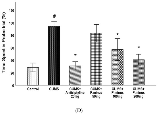 Open field test results have been expressed in four parts: total distance travelled by mice (Figure 4A), percentage of time spent in the central zone (Figure 4B), distance travelled in the central zone (Figure 4C), and no of rearing (Figure 4D). In the first part (A), the CUMS group showed a less travelled distance with a p < 0.05 level of significance as compared to the control, which was only reversed by CUMS + Amitriptyline 20 mg group by p < 0.05 significance. The remaining CUMS+ P. minus treated groups showed a non-significant increase in travelled distance as compared to CUMS group. For the percentage of time spent and covered distance in the central zone, results have been shown in Figure 4B,C respectively, which expressed that the CUMS group had shown a significantly (p < 0.05) small residence time and shorter distance in the central zone in comparison to the control group. Only CUMS + Amitriptyline 20 mg treatment improved timings and travelled distance in the central zone significantly (p < 0.05), whereas the CUMS + P. minus 50 mg,100 mg and 200 mg groups showed non-significance improvement in both timings and distance as compared to CUMS group. Results for rearing behavior are presented in Figure 4(D), which indicates that there was no significant difference between the control and CUMS groups, as well as all remaining treated groups had non-significant differences in comparison to the CUMS group.