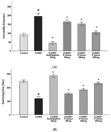 As sketched in Figure 6A, CUMS group showed an increased immobility time which indicates that CUMS had induced depression significantly which was reversed in all treatment groups. CUMS + Amitriptyline 20 mg and CUMS + P. minus 200 mg reduced immobility by p < 0.05 level of significance, whereas CUMS + P. minus 100 mg and 50 mg treated groups also reduced immobility significantly. The results of swimming behavior during the forced swimming test are presented in (B) part of Figure 6, which expressed that swimming time was significantly less in CUMS group as compared to the Control. This reduced swimming time was significantly enhanced in CUMS + Amitriptyline 20 mg, CUMS + P. minus 200 mg and P. minus 100 mg. The significance level of improved swimming behavior in CUMS + P. minus 50 mg treated group was p < 0.05. The results demonstrate the anti-depressant effect of Amitriptyline and P. minus treated groups with CUMS induced depression model of mice.