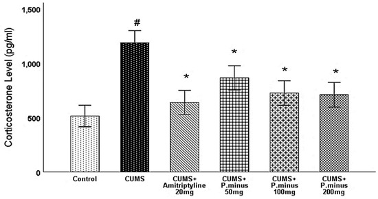 Effects of P. minus aqueous extract on serum corticosterone level (pg/mL) in CUMS induced depressive mice. # (p < 0.05), vs. Control group; * (p < 0.05), vs. CUMS group, (n = 6).