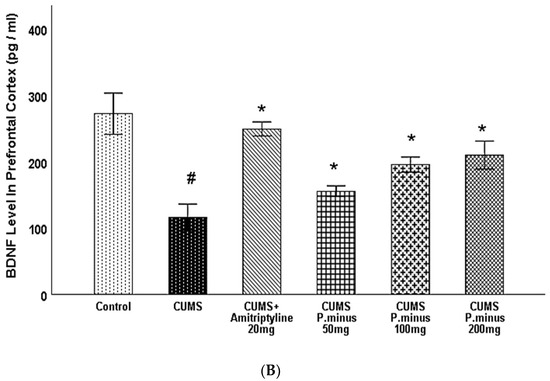 Figure 8A, B presents the results of BDNF levels influenced by treatment and CUMS in the hippocampus and prefrontal cortex. Variations of BDNF levels in the hippocampus are expressed, which demonstrates that CUMS group had significantly reduced the BDNF level in the hippocampus. This reduction was inverted by CUMS + Amitriptyline+ 20 mg, P. minus 200 mg and100 mg treated groups significantly, but CUMS + P. minus 50 mg treated group did not show any significant variations in hippocampal BDNF level. In Figure 8B BDNF level variations in the prefrontal cortex are shown, according to these results CUMS also decreased the BDNF level in the prefrontal cortex but this effect was reversed by all treatment groups significantly. The CUMS + Amitriptyline 20 mg showed more improvement in BDNF levels in the hippocampus and prefrontal cortex as compared to P. minus treated groups