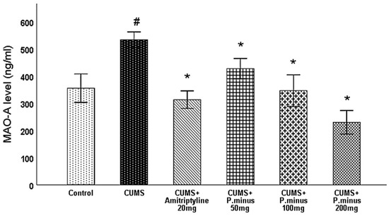 Effects of P. minus aqueous extract on MAO-A level (ng/mL) in CUMS induced depressive mice. # (p < 0.05), vs. Control group; * (p < 0.05), vs. CUMS group, (n = 6).