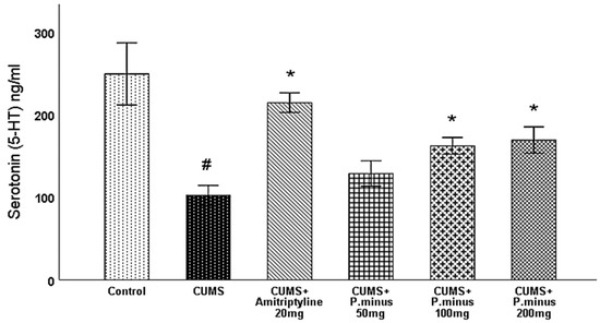 Effects of P. minus aqueous extract on Serotonin (5-HT) level(ng/mL) in CUMS induced depressive mice. # (p < 0.05), vs. Control group; * (p < 0.05), vs. CUMS group, (n = 6).