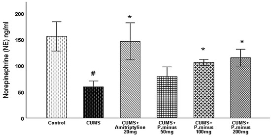 Effects of P. minus aqueous extract on Norepinephrine (NE) level(ng/mL) in CUMS induced depressive mice. # (p < 0.05), vs. Control group; * (p < 0.05), vs. CUMS group, (n = 6).