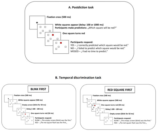 Postdiction task (A). Five empty squares were presented on the display. Participants predicted which of the five squares would turn red. Temporal discrimination task (B). After presenting the five squares, the screen blinked (blink first), or one of the squares turned red (red square first). Participants indicated whether they observed the blink or the flashed red square first. Following the literature convention, negative delay (−100 ms) refers to the case when the red square is the first.
