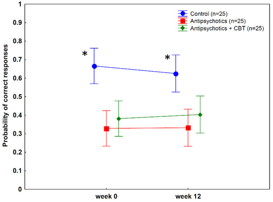 Temporal discrimination performance (mean probability of correct responses, 95% confidence intervals). Patients with schizophrenia were less accurate than controls both before and after treatment. (* week 0, controls vs. antipsychotics: p = 0.0001; controls vs. antipsychotics plus CBT: p = 0.002; week 12, controls vs. antipsychotics: p = 0.001; controls vs. antipsychotics + CBT: p = 0.01, Tukey’s test).