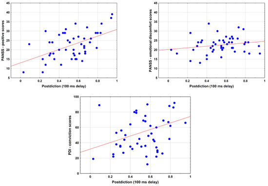 At 0 week, PANSS positive, PANSS emotional distress, and PDI conviction values predicted postdiction scores at short delay when corrected for age, education, and sex (PANSS positive: b* = 0.58, SE = 0.12, p < 0.001; PANSS emotional discomfort: b* = 0.36, SE = 0.13, p = 0.008; PDI conviction: b* = 0.34, SE = 0.14, p = 0.02). However, only the PANSS positive (r = 0.59, p < 0.001) and PDI conviction scores (r = 0.33, p = 0.02) correlated with postdiction. The PANSS emotional discomfort scores–postdiction correlation was not significant (r = 0.21, p = 0.15) (Figure 5).