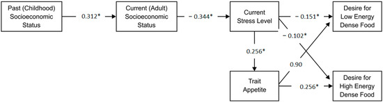 Table 4, path 2b), shows an opposite effect whereby past (childhood) SES had a significant negative effect on the desire for high-energy-dense food, meaning when trait appetite is factored into the analysis, if an adult study participant had high childhood SES, they were more likely to have low trait appetite and a low desire for high-energy-dense food. In contrast, if an adult participant had low childhood SES, they were more likely to have a high trait appetite and a high desire for high-energy-dense food.
