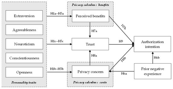 In contrast to immaturity, impatience, and impulsiveness, conscientious people are reliable and cautious, with a strong feeling of personal accomplishment [62]. People with this personality trait have a strong sense of privacy protection and risk avoidance [70]. They are inclined to evaluate the possible hazards of disclosing private information while making privacy decisions and are very concerned about privacy issues [40,58]. Simultaneously, conscientious users will have a better understanding of the advantages, whether the usefulness perception or the enjoyment perception, of disclosing information [47,71]. Furthermore, several studies have revealed that conscientiousness influences the trust level of individuals, whereas the conclusions are not unique. It was, for example, found by Bawack et al. [53] that dutiful users are more likely to trust a smart speaker voice-guided service that provides a positive experience. Nevertheless, Pour and Taheri [51] found that conscientiousness leads to a lower disposition to trust, while Zhou and Lu [45] and Bansal et al. [44] proved that there is no significant relationship between conscientiousness and trust. In the context of App privacy authorization, we hypothesize that people with traits of conscientiousness will be especially cautious in their decisions, which implies that they will weigh the various benefits of authorizing personal information, be more concerned about personal privacy information, and have a higher trust threshold with the App provider. These are the hypotheses: