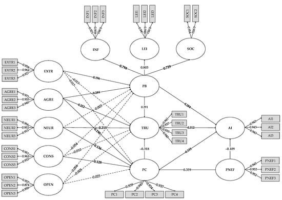 Because the perceived benefits of mobile App users are second-order variables consisting of information source, leisure, and social interaction, and there are many discrepancies in the findings of personality traits on users’ privacy perceptions in the prior literature, the effects of personality traits on users’ perceived benefits, privacy concern, and trust in the context of App authorization need to be further explored; therefore, we use the more prediction-oriented partial least squares structural equation model (PLS-SEM) to validate the relationships among the factors [95].