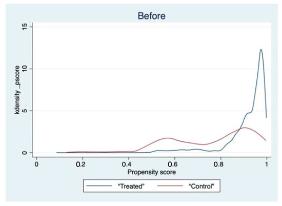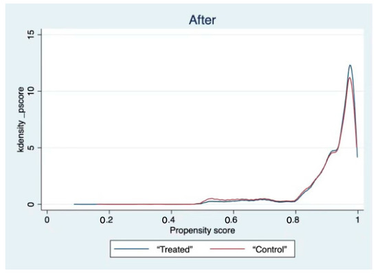 Table 5 shows that all the variables are well matched. Additionally, kernel density function plots are reported (see Figure 1 and Figure 2). The graph shows that the matched curves of the treatment and control groups overlap, indicating that the treatment and control groups are well matched, which effectively eliminates the possibility of sample selectivity bias.