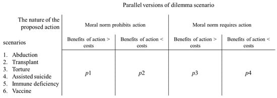 On the basis of the combination of norms (required/prohibited) and consequences (the benefits of the action are greater/lesser than the costs; see Figure 1), the CNI model extends the classical moral dilemmas (kill one person to save five) to four types of scenarios: (1) dilemmas involving prohibited norms that prohibit action, where the benefits of the action are greater than the costs; (2) dilemmas involving prohibited norms that prohibit action, where the benefits of the action are less than the costs; (3) dilemmas involving required norms that require action, where the benefits of the action are greater than the costs; and (4) dilemmas involving required norms that require action, where the benefits of the action are less than the costs [3,4]. People choose whether to take action in these four types of scenarios. Recent studies using the CNI model have focused on moral decisions based on these four types of dilemma scenarios.