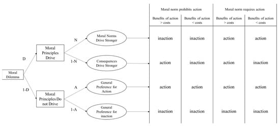 To support this parallel processing logic and parameter calculation of the CAN algorithm, Liu and Liao [7] set up an alternative multinomial processing tree model. In a parallel processing manner, people’s moral decisions are driven by one of the norm or consequence principles, depending on which is stronger. This is more accurate than the CNI model for depicting the moral decision-making process, according to the literature [16,17].