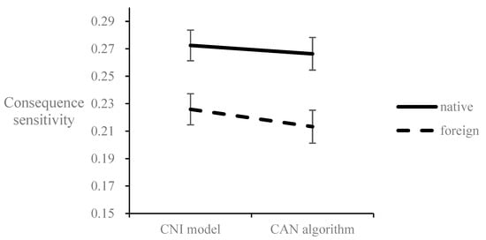 Consequence sensitivity estimated by the CNI model and the CAN algorithm significantly interacts with the foreign/native language condition. Error bar represents the ±1 standard error.