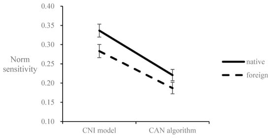 Norm sensitivity estimated by the CNI model and the CAN algorithm marginally interacts with the foreign/native language condition. Error bar represents the ±1 standard error.
